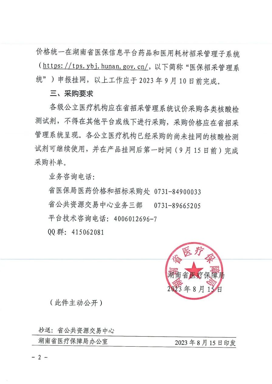 2023年8月16日,湖南省醫(yī)保局發(fā)布《關(guān)于核酸檢測試劑實(shí)行陽光掛網(wǎng)采購有關(guān)事項(xiàng)的通知》,要求相關(guān)生產(chǎn)企業(yè)將用于各類核酸檢測的上市試劑產(chǎn)品(新型冠狀病毒核酸檢測類除外)于2023年9月10日前,以湖南省醫(yī)療機(jī)構(gòu)實(shí)際交易最低價在湖南醫(yī)保招采管理系統(tǒng)申報掛網(wǎng)。