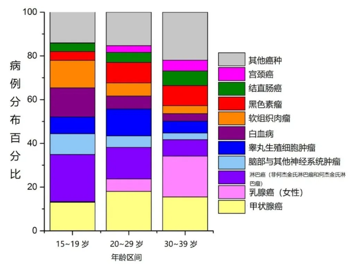 2012 年至 2016 年青少年和青壯年主要癌癥類(lèi)型的病例分布(%),圖片來(lái)源:參考文獻(xiàn)[5]