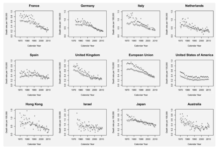1970 年至 2012 年,在不同國(guó)家和地區(qū),女性甲狀腺癌死亡率穩(wěn)定下降,圖片來(lái)源:參考文獻(xiàn)[4]